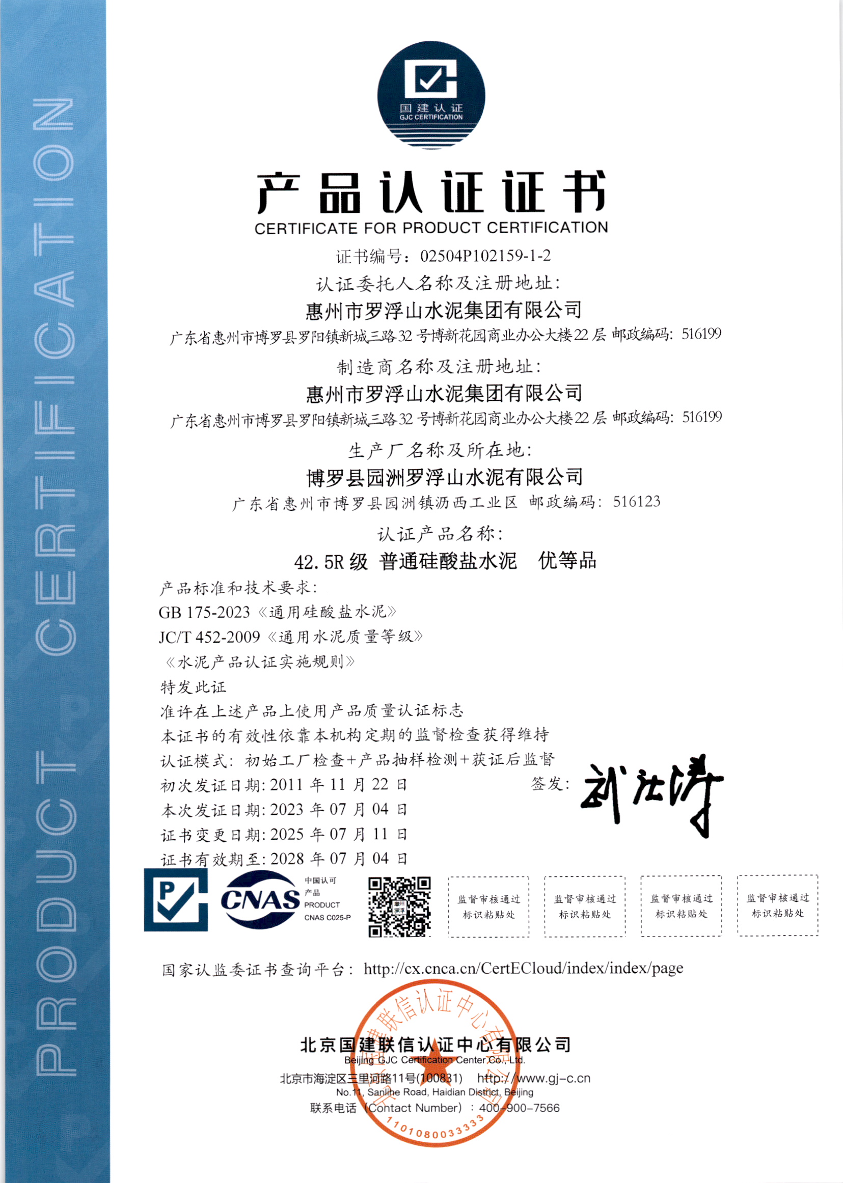 博罗县园洲罗浮山水泥有限公司-42.5(产品认证证书)