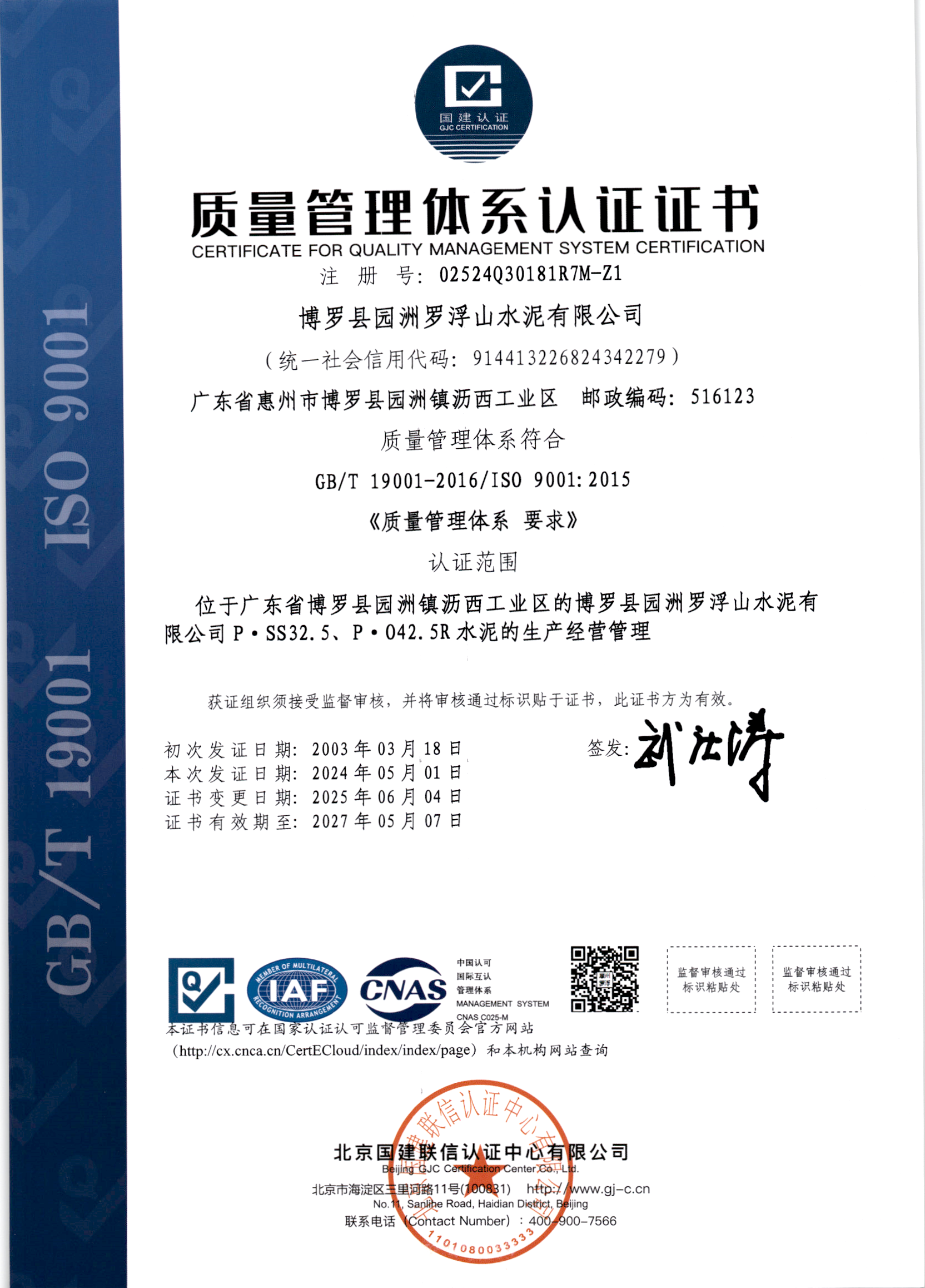 | 博罗县园洲罗浮山水泥有限公司-质量管理体系认证证书 |