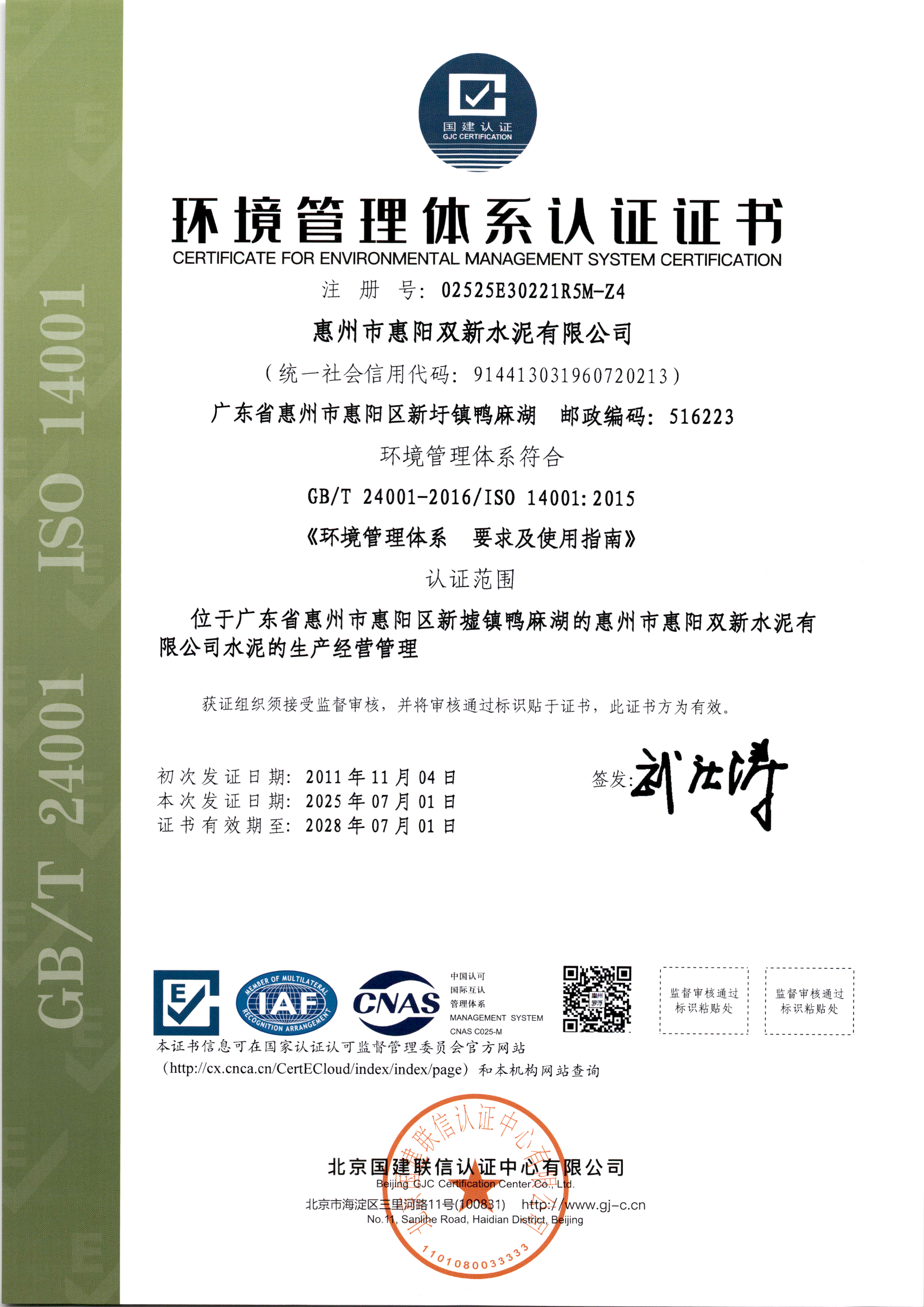 首页 > 资质认证 > 惠州市惠阳双新水泥有限公司-环境管理体系认证证书