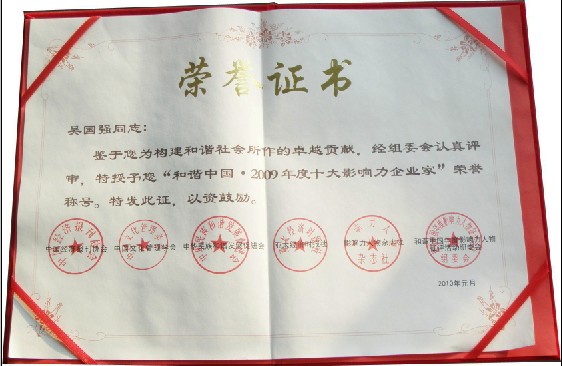 吴国强董事长荣获“2009年度十大影响力企业家”称号
