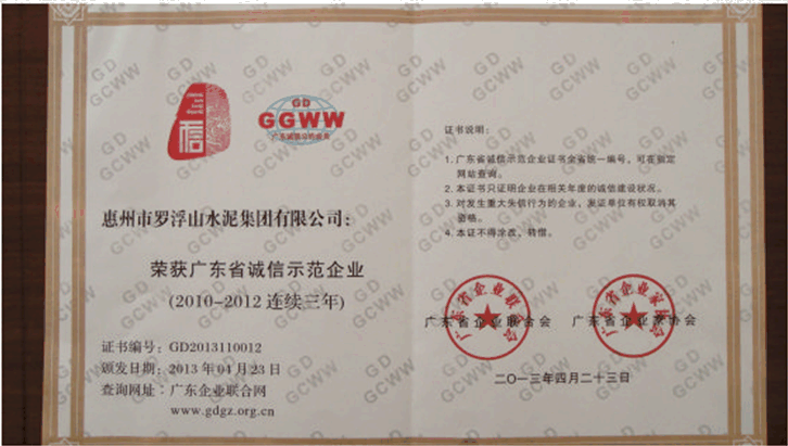 罗浮山水泥集团连续五年荣获"广东省诚信示范企业"